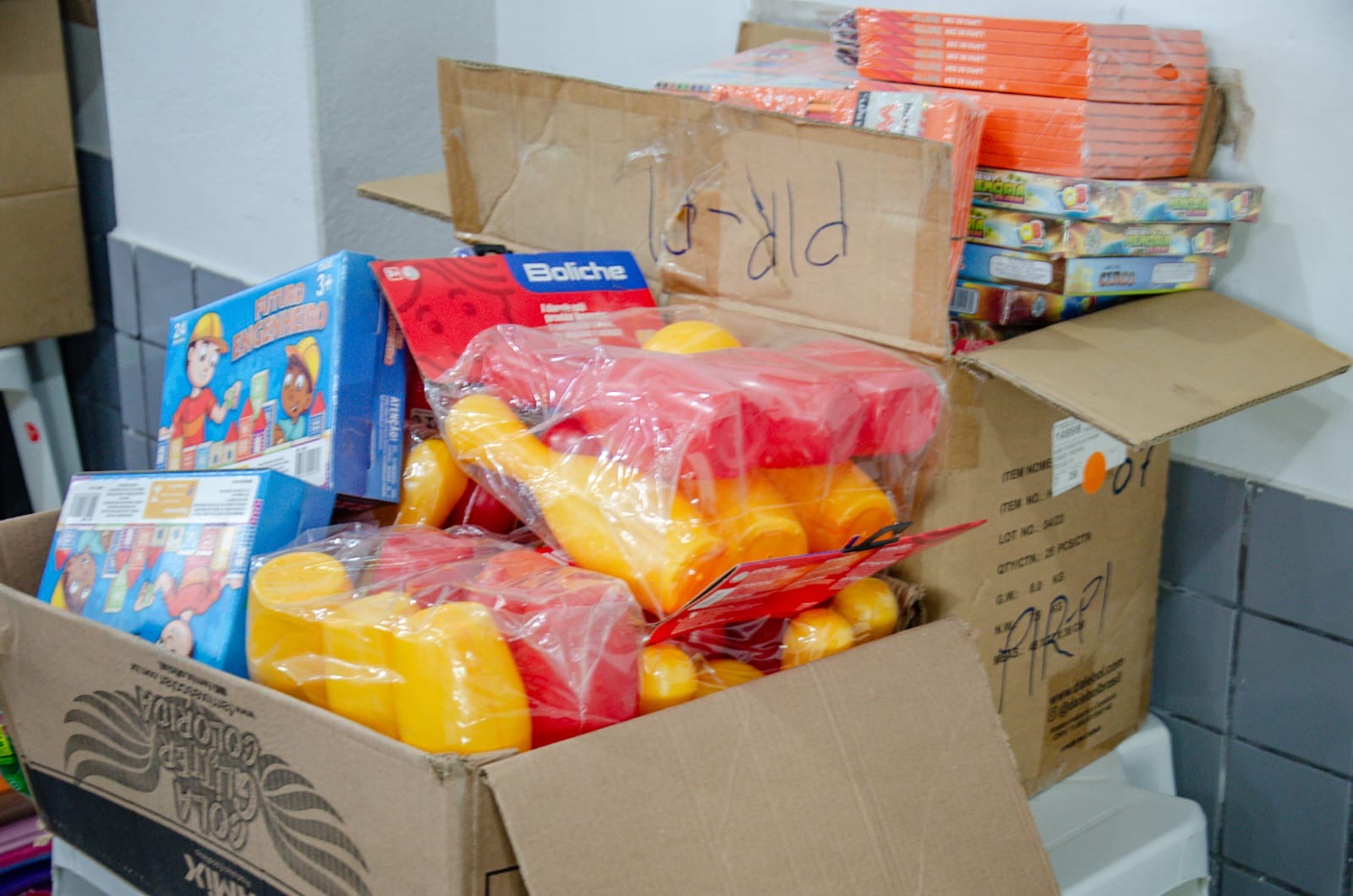 Os kits incluem cadernos, lápis, jogos educativos, tinta guache, massa de modelar, tesoura, cartolina, entre outros itens