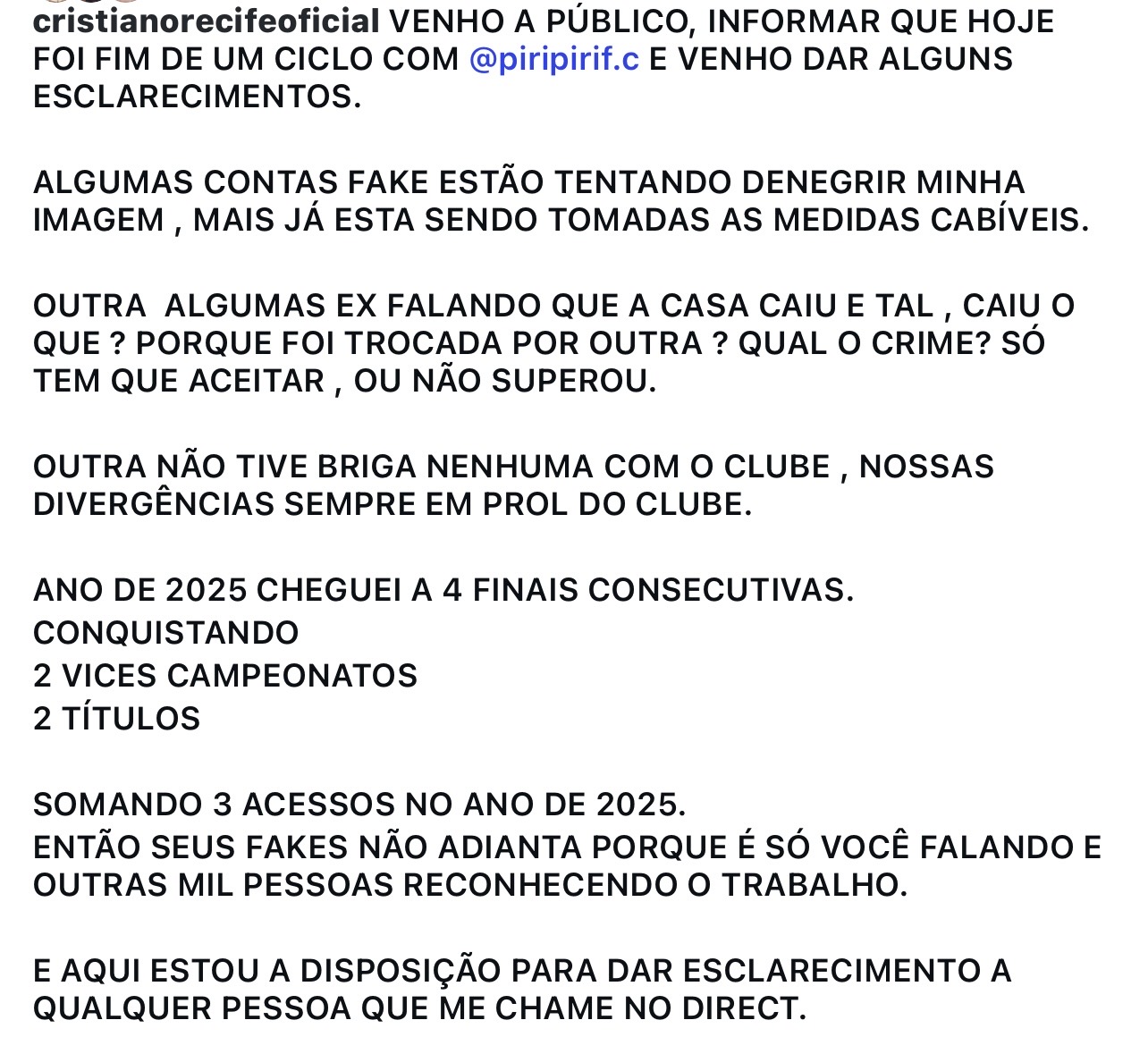 Cristiano declarou que contas falsas estariam tentando denegrir sua imagem, informando que medidas cabíveis já estão sendo tomadas. Ele também negou qualquer desentendimento com o clube, afirmando que eventuais divergências sempre foram “em prol do clube”.