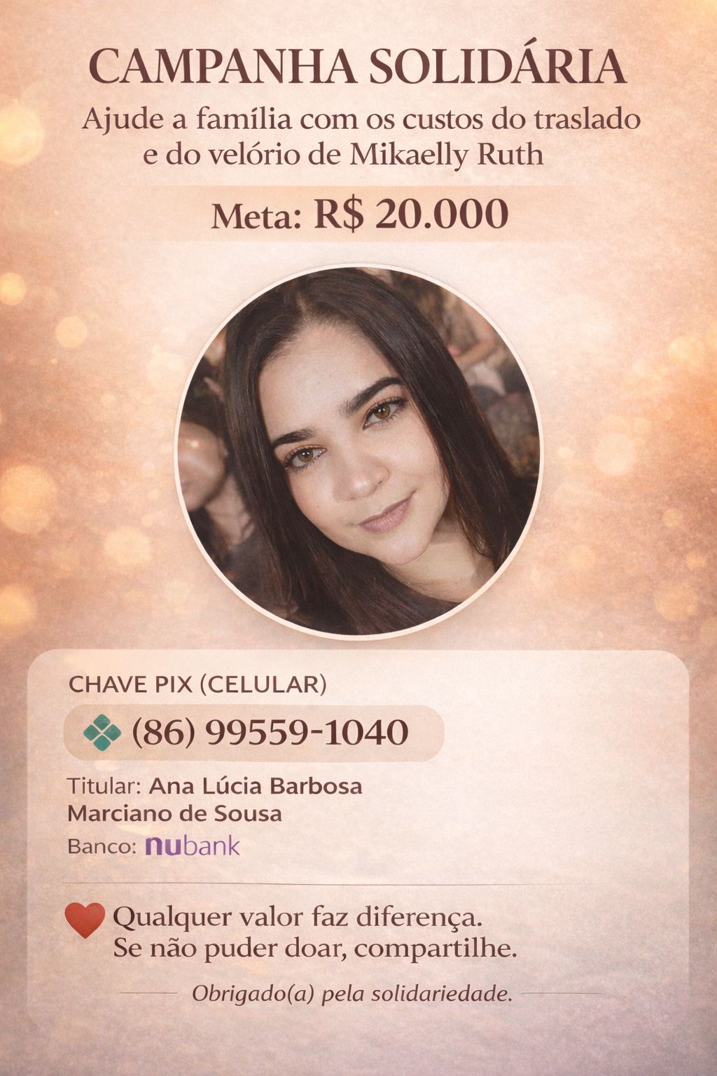 Familiares e amigos lançaram uma campanha solidária com o objetivo de arrecadar recursos destinados ao custeio das despesas de traslado e velório de Mikaelly Ruth, que faleceu no Rio de Janeiro. A iniciativa busca alcançar a meta de R$ 20.000, valor estimado para cobrir os custos necessários.