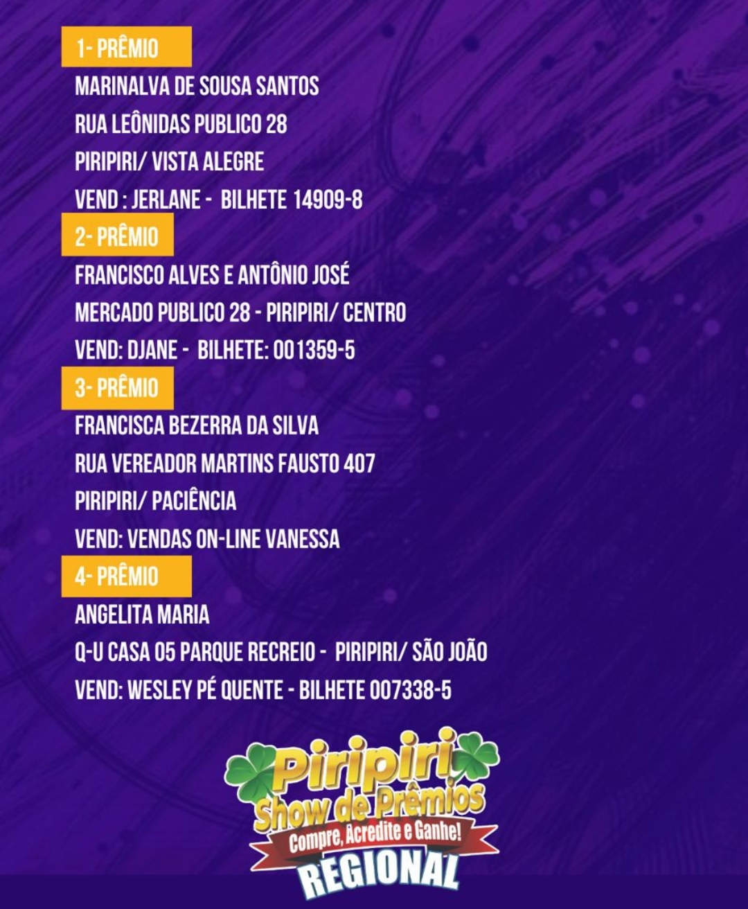 Além das motos, diversos outros prêmios foram entregues, incluindo o primeiro e o segundo prêmio, cada um no valor de R$ 2.000,00.