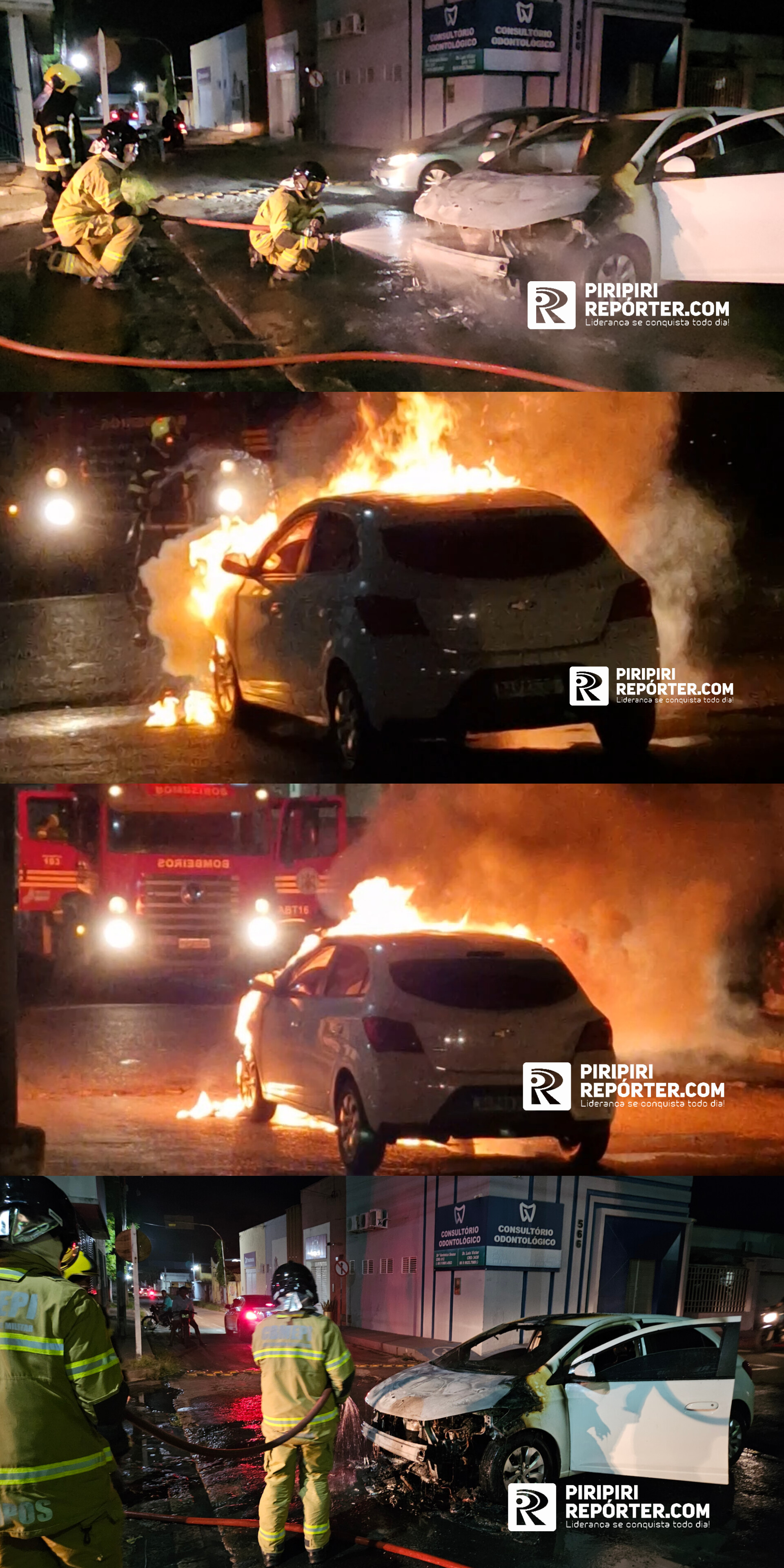 O Onix branco pegou fogo na rua Santos Dumont, em um cruzamento na região central de Piripiri.